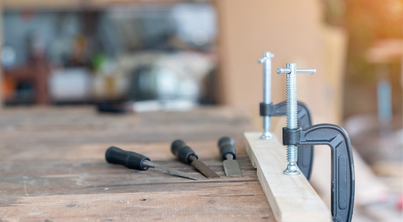 - Сборка мебели. Для временной фиксации конструкции, прижимания склеиваемых элементов, удержания деталей во время сверления.