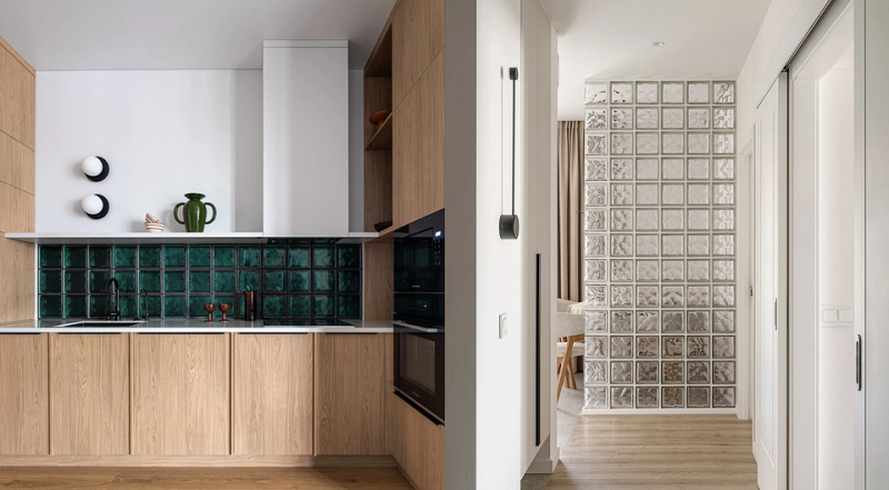 Если вы хотите оригинально оформить кухонный фартук, стеклоблоки станут отличным решением. Это не просто визуально эффектная отделка — она подходит для кухни по всем техническим характеристикам. Брикеты из стекла не боятся влаги, перепада температур, легко моются и не требуют особого ухода. На них не заведутся плесень, грибок и опасные для здоровья бактерии, и в целом экологичность материала позволяет использовать его в зоне готовки.